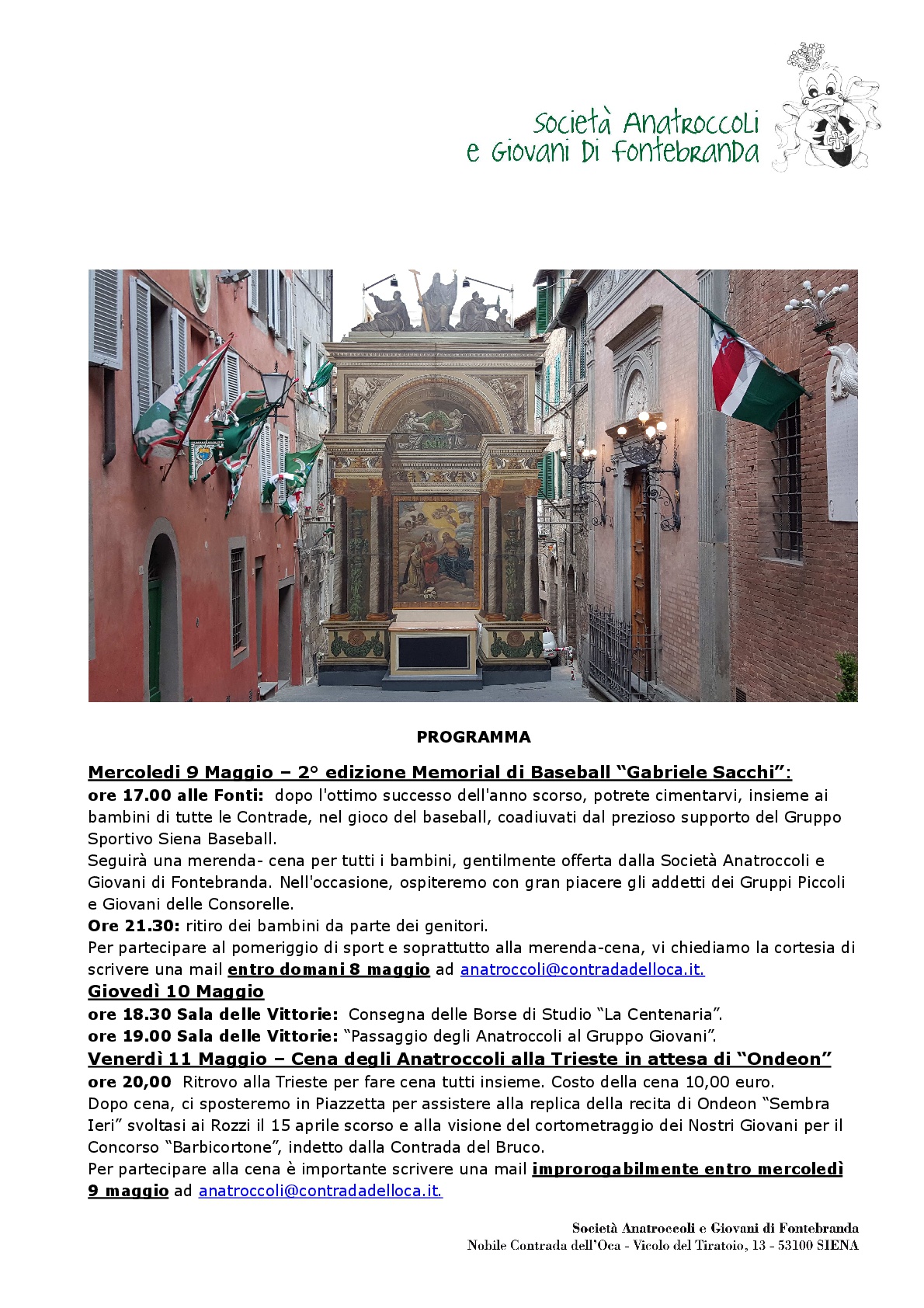 Siena, Contrada dell’Oca: Programma Festeggiamenti 2018″ della “Società Anatroccoli e Giovani di Fontebranda” Qua sotto vi proponiamo il Programma ” Festeggiamenti 2018” dei Giovani della Contrada dell’Oca e degli ” Anatroccoli“: Condividi sul web: Fai clic per condividere su Facebook (Si apre in una nuova finestra) Facebook Fai clic per condividere su WhatsApp (Si apre in una nuova finestra) WhatsApp Fai clic per condividere su Telegram (Si apre in una nuova finestra) Telegram Fai clic per condividere su X (Si apre in una nuova finestra) X Fai clic qui per stampare (Si apre in una nuova finestra) Stampa Fai clic per inviare un link a un amico via e-mail (Si apre in una nuova finestra) E-mail Mi piace Caricamento... Correlati
