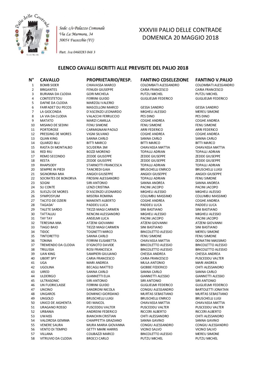 Sono 58 i cavalli iscritti alle “Previsite“, che vi ricordiamo verranno effettuate Martedì 15/05, mentre la tratta è prevista Mercoledì 16/5 durante il pomeriggio.