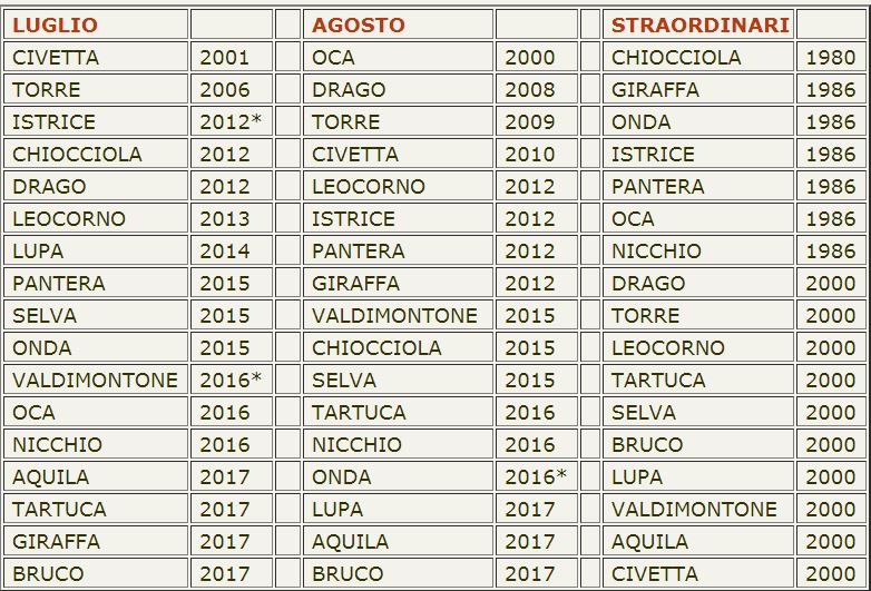 Nella tabella sottostante, i ritardi delle Contrade nell’estrazione a sorte per i Palli di Luglio , di Agosto e per gli Straordinari: