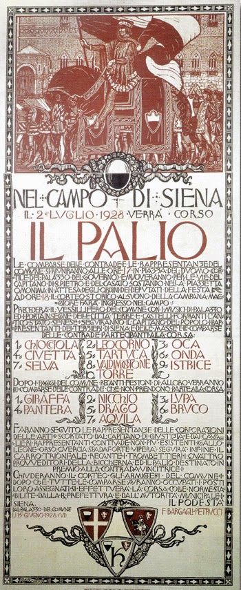 Dario Neri è autore, insieme a Giovanni Cecchini, de “Il Palio di Siena”, uscito proprio per Electa nel 1958, su commissione del Monte dei Paschi, opera ancora oggi letta con interesse per la commistione di erudizione e passione paliesca. Ma Siena e il Palio sono una costante per Neri che dipinge alcuni drappelloni, disegna le monture per i rinnovi dell’Onda, della Chiocciola, della Pantera (questi ultimi non realizzati), per il rinnovo del corteo del 1928 e nuovamente per l’Onda nel 1955. La sua Onda. Contradaiolo di fede profonda, è stato Capitano vittorioso il 2 luglio 1950 con Giuseppe Gentili detto Ciancone e Gioia. Ricoprirà tale prestigiosa carica dal 1937 al 1952. A Dario Neri viene conferito il Mangia d’oro nel 1954. Muore improvvisamente a Milano nel 1958.