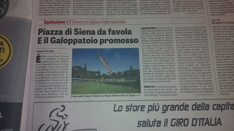 Vi propongo l’articolo uscito stamani 26/05 sulla “Gazzetta dello Sport“, che parla del ConcorsoIppico Internazionale, che si svolge a Roma a Piazza di Siena: