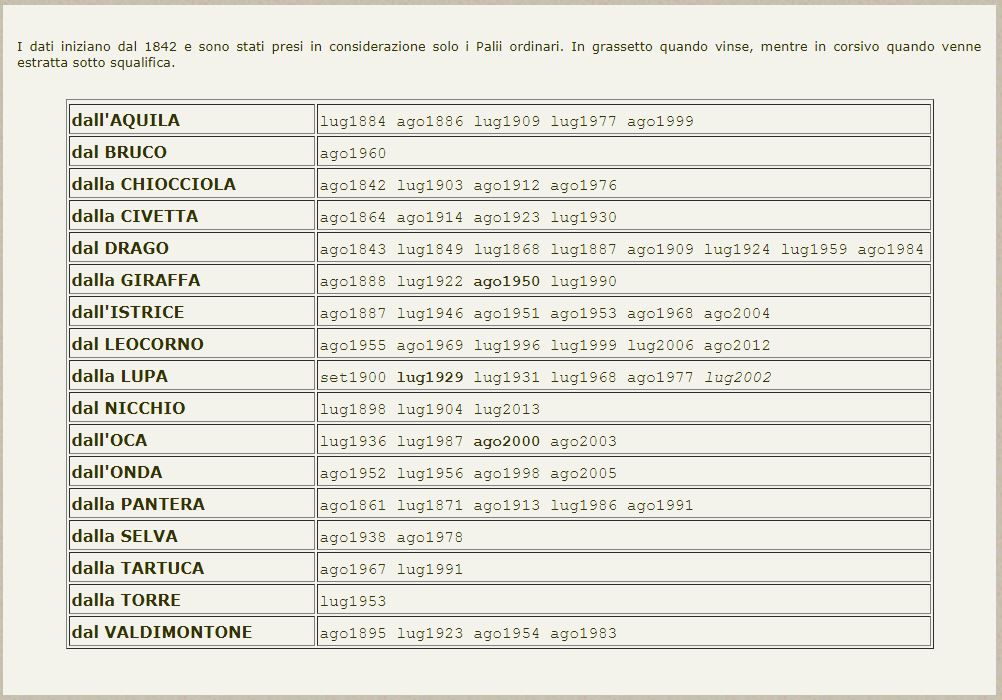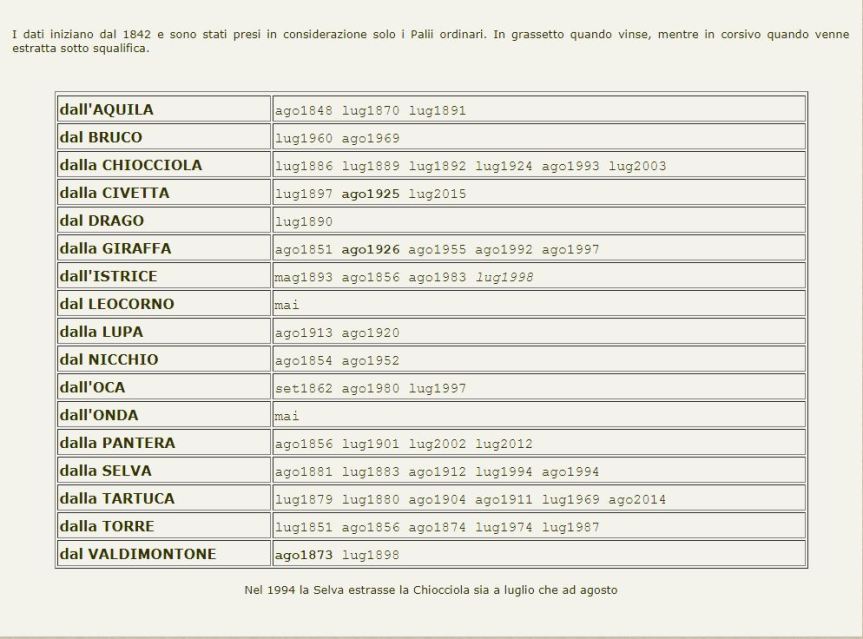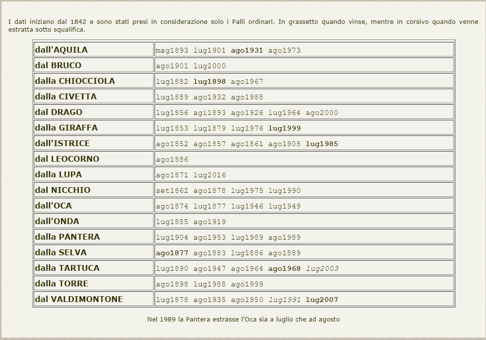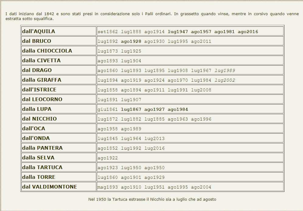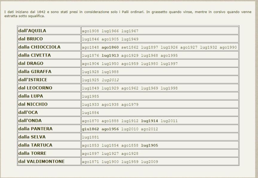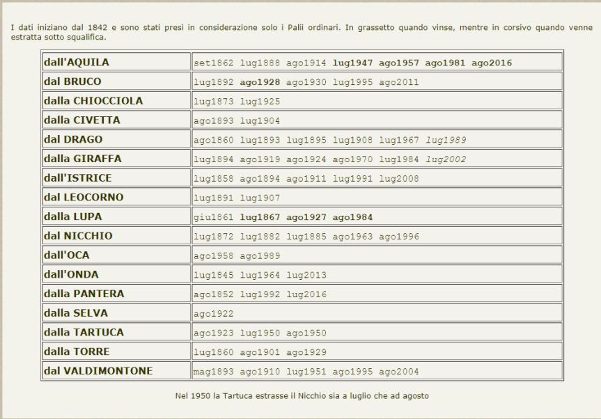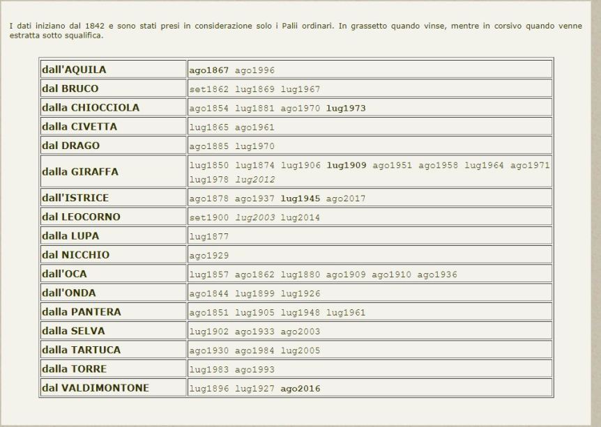 Palio di Siena: Statistica Estrazione a sorte Contrada per Contrada Aquila: Bruco: Chiocciola: Civetta: Drago: Giraffa: Istrice: Leocorno: Lupa: Nicchio: Oca: Onda: Pantera: Selva: Tartuca: Torre: Valdimontone: Fonte: https://www.ilpalio.org Condividi sul web: Fai clic per condividere su Facebook (Si apre in una nuova finestra) Facebook Fai clic per condividere su WhatsApp (Si apre in una nuova finestra) WhatsApp Fai clic per condividere su Telegram (Si apre in una nuova finestra) Telegram Fai clic per condividere su X (Si apre in una nuova finestra) X Fai clic qui per stampare (Si apre in una nuova finestra) Stampa Fai clic per inviare un link a un amico via e-mail (Si apre in una nuova finestra) E-mail Mi piace Caricamento... Correlati