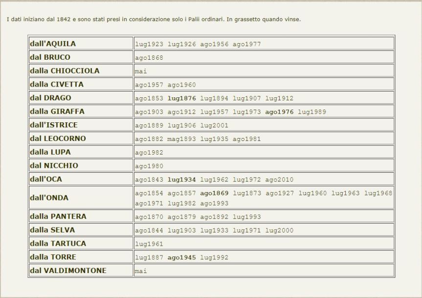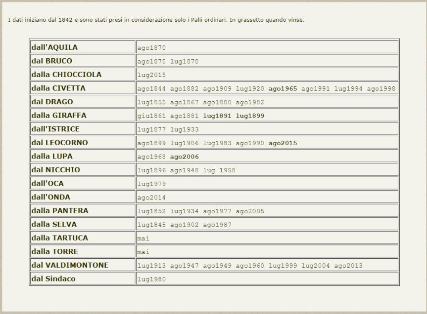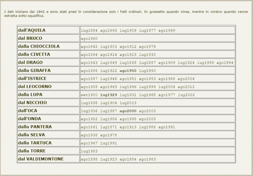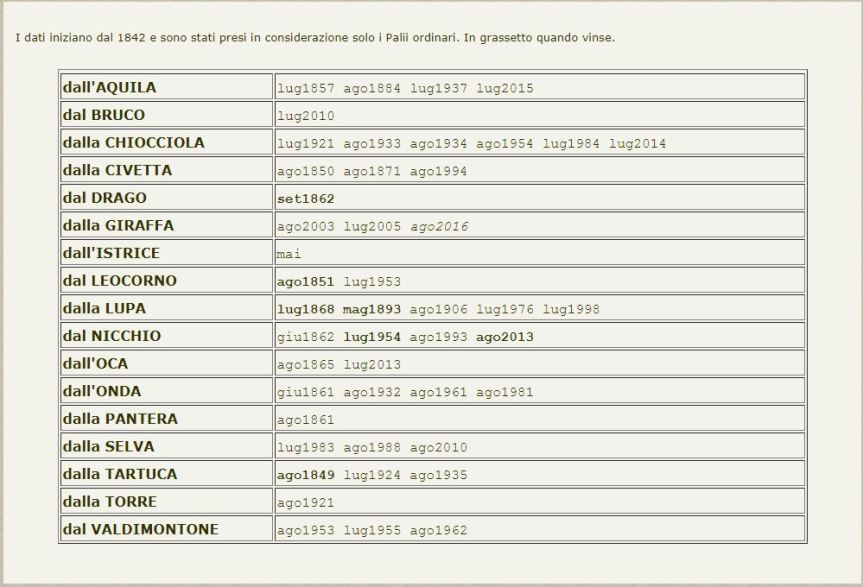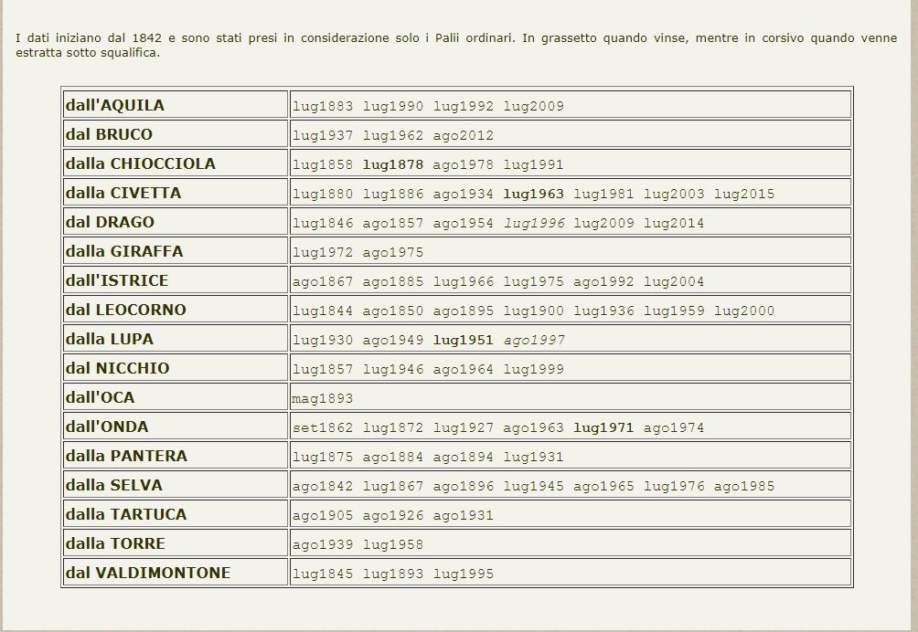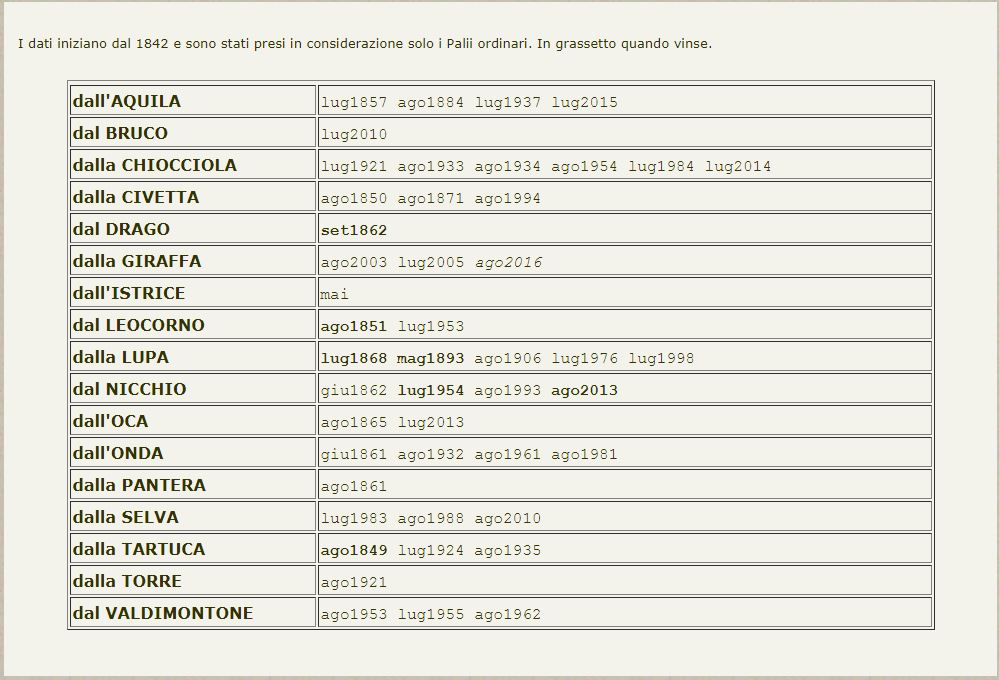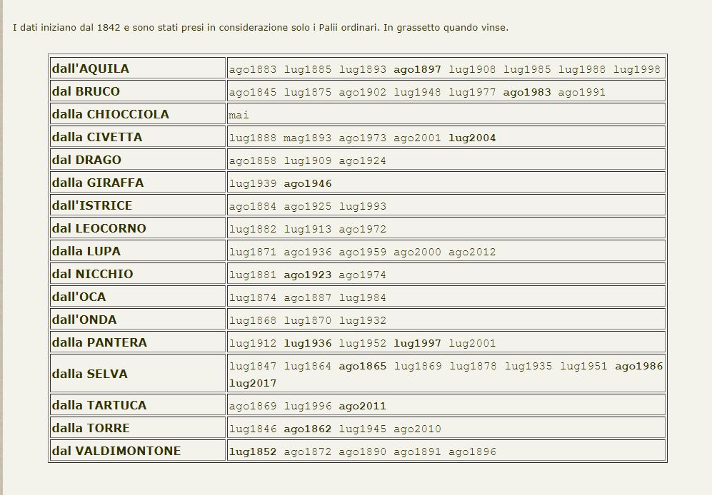 Palio di Siena: Statistica Estrazione a sorte Contrada per Contrada Aquila: Bruco: Chiocciola: Civetta: Drago: Giraffa: Istrice: Leocorno: Lupa: Nicchio: Oca: Onda: Pantera: Selva: Tartuca: Torre: Valdimontone: Fonte: https://www.ilpalio.org Condividi sul web: Fai clic per condividere su Facebook (Si apre in una nuova finestra) Facebook Fai clic per condividere su WhatsApp (Si apre in una nuova finestra) WhatsApp Fai clic per condividere su Telegram (Si apre in una nuova finestra) Telegram Fai clic per condividere su X (Si apre in una nuova finestra) X Fai clic qui per stampare (Si apre in una nuova finestra) Stampa Fai clic per inviare un link a un amico via e-mail (Si apre in una nuova finestra) E-mail Mi piace Caricamento... Correlati