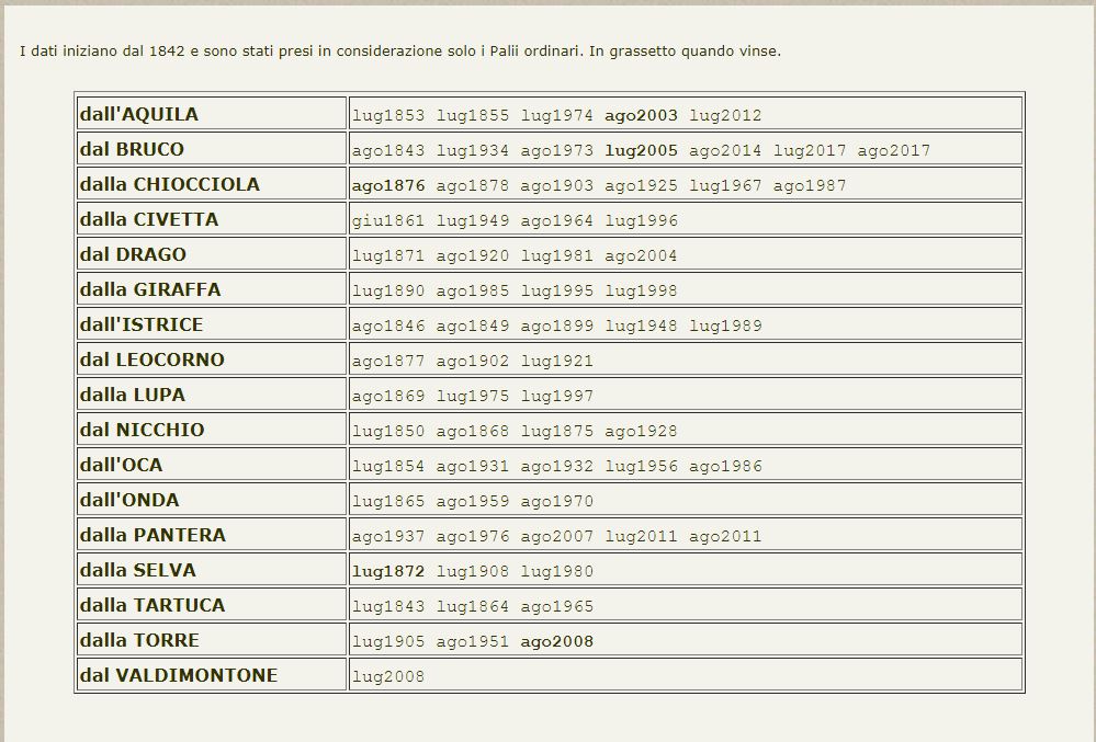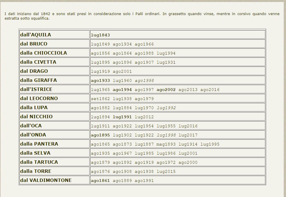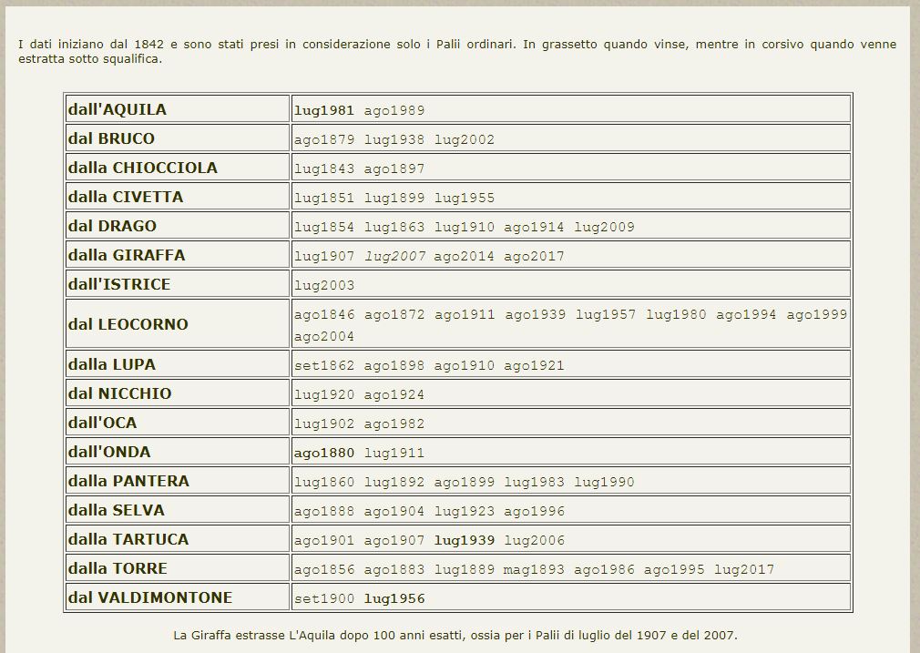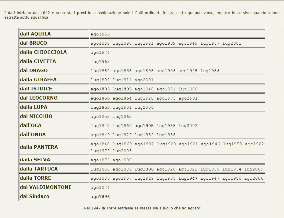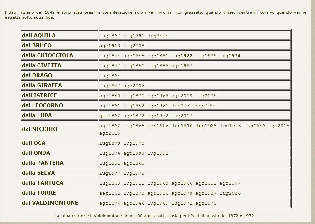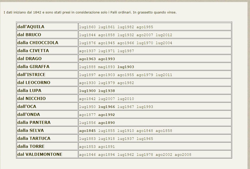 Palio di Siena: Statistica Estrazione a sorte Contrada per Contrada Aquila: Bruco: Chiocciola: Civetta: Drago: Giraffa: Istrice: Leocorno: Lupa: Nicchio: Oca: Onda: Pantera: Selva: Tartuca: Torre: Valdimontone: Fonte: https://www.ilpalio.org Condividi sul web: Fai clic per condividere su Facebook (Si apre in una nuova finestra) Facebook Fai clic per condividere su WhatsApp (Si apre in una nuova finestra) WhatsApp Fai clic per condividere su Telegram (Si apre in una nuova finestra) Telegram Fai clic per condividere su X (Si apre in una nuova finestra) X Fai clic qui per stampare (Si apre in una nuova finestra) Stampa Fai clic per inviare un link a un amico via e-mail (Si apre in una nuova finestra) E-mail Mi piace Caricamento... Correlati