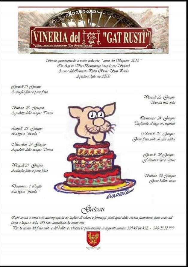 Palio di Asti, Rione San Paolo: 21-30/06 “Vineria del Gat Rustì” Al Rione San Paolo torna, dal 21/06 al 30/06: Vineria del Gat Rustì Serate gastronomiche e teatro per le vie del Rione A cura del Comitato palio del Rione Qua sotto il programma Condividi sul web: Fai clic per condividere su Facebook (Si apre in una nuova finestra) Facebook Fai clic per condividere su WhatsApp (Si apre in una nuova finestra) WhatsApp Fai clic per condividere su Telegram (Si apre in una nuova finestra) Telegram Fai clic per condividere su X (Si apre in una nuova finestra) X Fai clic qui per stampare (Si apre in una nuova finestra) Stampa Fai clic per inviare un link a un amico via e-mail (Si apre in una nuova finestra) E-mail Mi piace Caricamento... Correlati