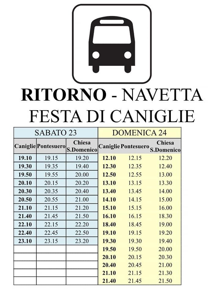Comodissimo servizio navetta da e per la Festa di Caniglie! Fermate Chiesa di San Domenico Savio – Loc Pontesuero – Caniglie! E alla festa stand gastronomico, musica e la domenica pomeriggio giochi GRATUITI per i bambini! 💛