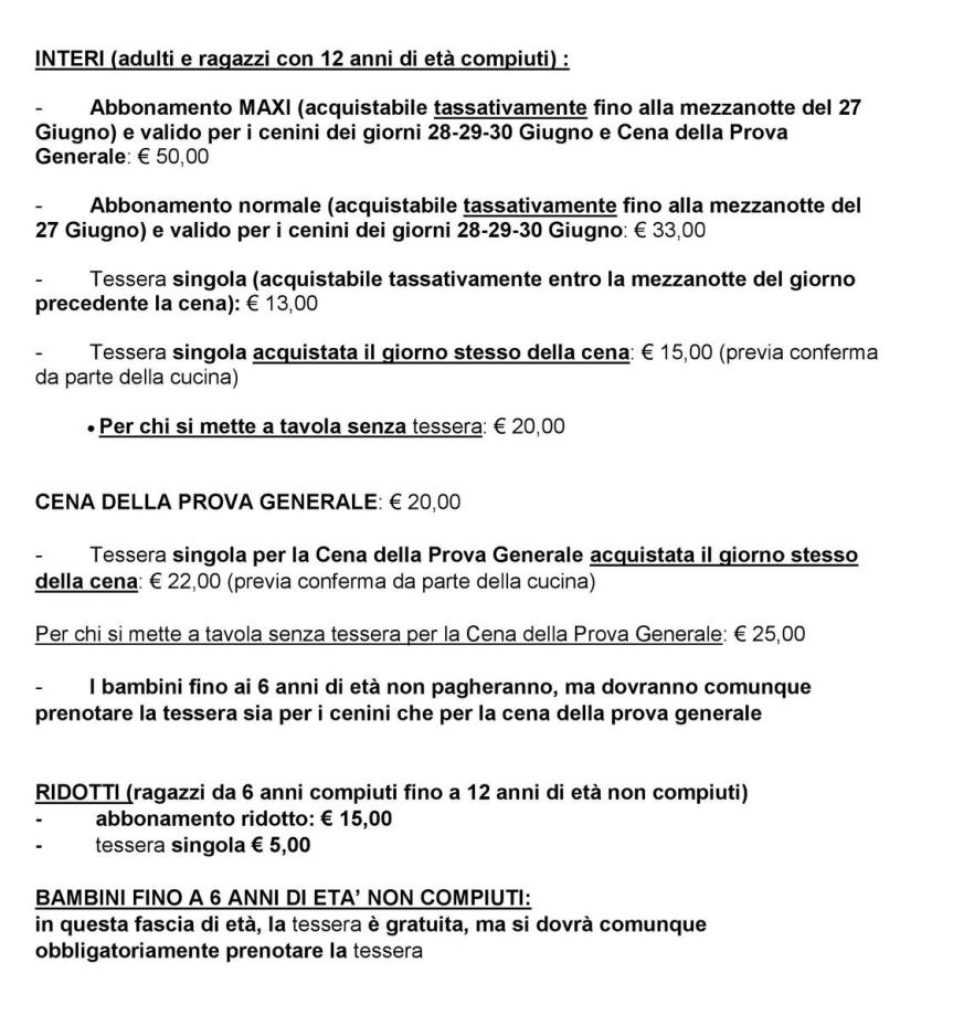 Come ormai sapete, per motivi organizzativi è necessario acquistare preventivamente le tessere per partecipare ai cenini, richiedendosi, inoltre, il massimo rispetto degli orari e delle date termine fissate per l’acquisto.