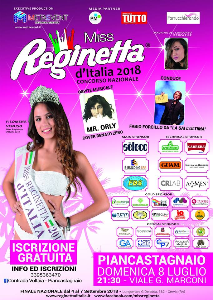 - ore 21:30 viale G. Marconi presso il giardino dell’ asilo Barzellotti sfilata e concorso di bellezza MISS REGINETTA D’ITALIA 2018