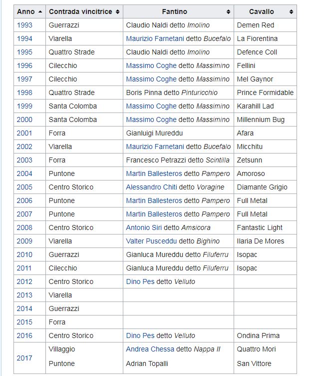 La prima vittoria è stata conquistata nel 1994 con Maurizio Farnetani, detto “Bucefalo”, su La Fiorentina; segue la vittoria nel 2002 sempre con Maurizio Farnetani su Michittu; nel 2009 con Valter Pusceddu detto “Bighino” su Ilaria de Mores; ifine, nel 2013 con Valter Pusceddu detto “Bighino” su Nadir de Mores.
