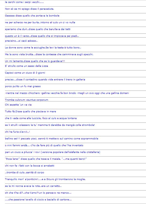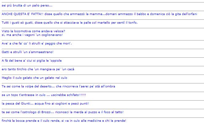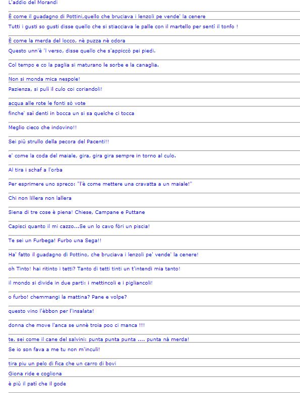 Siena: I Detti Senesi Ecco un’estratto di alcuni Detti Senesi. Non sono tutti, ma una buona parte Fonte: http://www.tuttosi.info Condividi sul web: Fai clic per condividere su Facebook (Si apre in una nuova finestra) Facebook Fai clic per condividere su WhatsApp (Si apre in una nuova finestra) WhatsApp Fai clic per condividere su Telegram (Si apre in una nuova finestra) Telegram Fai clic per condividere su X (Si apre in una nuova finestra) X Fai clic qui per stampare (Si apre in una nuova finestra) Stampa Fai clic per inviare un link a un amico via e-mail (Si apre in una nuova finestra) E-mail Mi piace Caricamento... Correlati