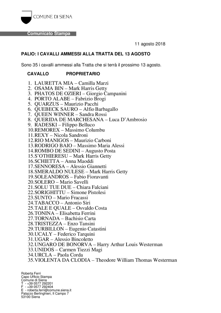 Palio di Siena: 35 cavalli ammessi alla Tratta del 13/08 Da poco sono stati diramati i nomi dei 35 cavalli ammessi alla Tratta di lunedì 13/08. Sotto il dettaglio dei nomi Massi Condividi sul web: Fai clic per condividere su Facebook (Si apre in una nuova finestra) Facebook Fai clic per condividere su WhatsApp (Si apre in una nuova finestra) WhatsApp Fai clic per condividere su Telegram (Si apre in una nuova finestra) Telegram Fai clic per condividere su X (Si apre in una nuova finestra) X Fai clic qui per stampare (Si apre in una nuova finestra) Stampa Fai clic per inviare un link a un amico via e-mail (Si apre in una nuova finestra) E-mail Mi piace Caricamento... Correlati