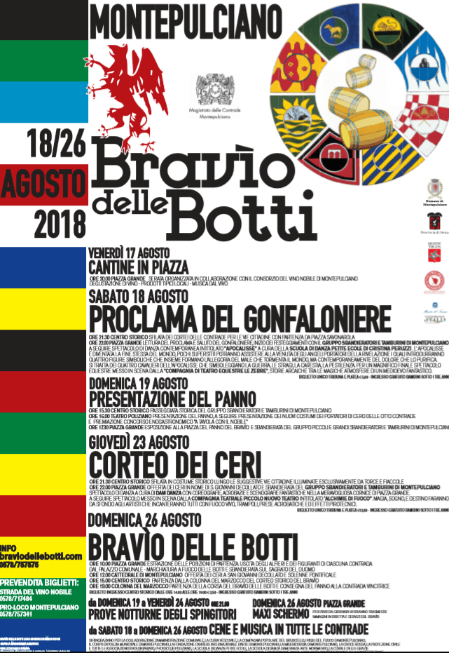 Il Bravìo delle Botti è la sfida tra otto contrade dislocate tutte lungo il centro storico cittadino, che si contendono un panno dipinto, facendo rotolare delle botti di circa 80 Kg ciascuna, lungo un percorso in salita di oltre un chilometro. Il percorso della gara si snoda tra le suggestive vie del centro storico della città poliziana fino all’arrivo situato sul sagrato del Duomo in Piazza Grande.