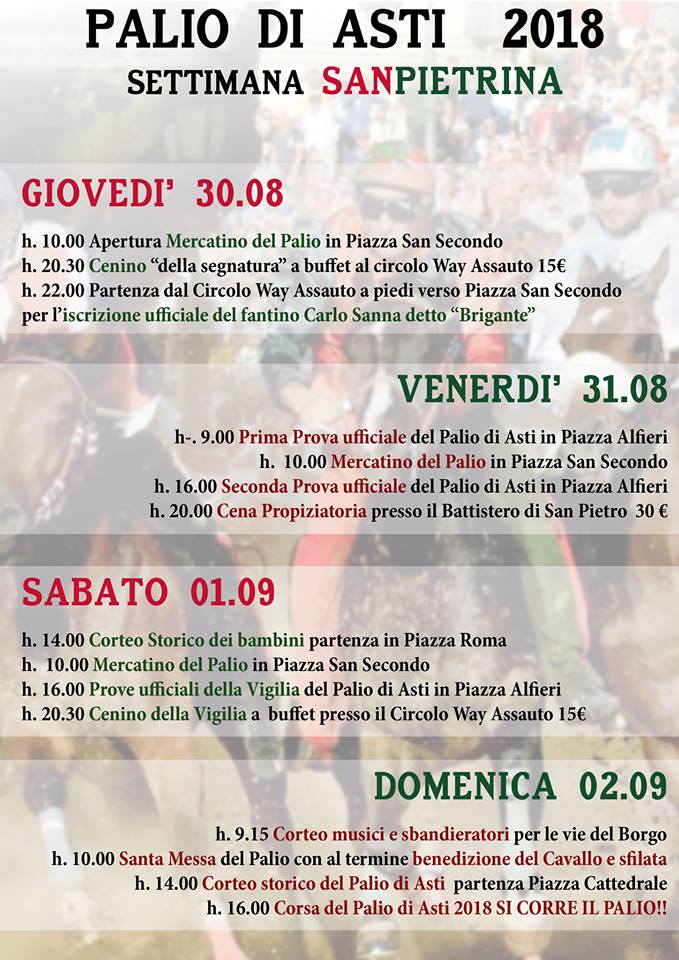 - h. 22.00 Partenza dal Circolo Way Assauto a piedi verso Piazza San Secondo per l’iscrizione ufficiale del fantino Carlo Sanna detto “Brigante”