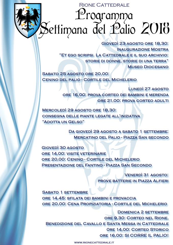 Palio di Asti, Rione Cattedrale: 23/08-02/09 Settimana Palio 2018 Ecco il programma della Settimana palio 2018, con le info e i numeri per poter prenotare Massi Condividi sul web: Fai clic per condividere su Facebook (Si apre in una nuova finestra) Facebook Fai clic per condividere su WhatsApp (Si apre in una nuova finestra) WhatsApp Fai clic per condividere su Telegram (Si apre in una nuova finestra) Telegram Fai clic per condividere su X (Si apre in una nuova finestra) X Fai clic qui per stampare (Si apre in una nuova finestra) Stampa Fai clic per inviare un link a un amico via e-mail (Si apre in una nuova finestra) E-mail Mi piace Caricamento... Correlati