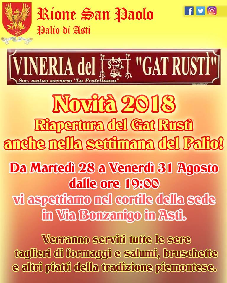 Palio di Asti, Rione San Paolo, Vineria del Gat Rustì: Apertura straordinaria Palio di Asti 2018 Il Rione San Paolo apre il Gat Rustì anche nella settimana del Palio di Asti 2018. Vi aspettiamo tutte le sere dalle ore 19:00 dal 28 al 31 Agosto!! Massi Condividi sul web: Fai clic per condividere su Facebook (Si apre in una nuova finestra) Facebook Fai clic per condividere su WhatsApp (Si apre in una nuova finestra) WhatsApp Fai clic per condividere su Telegram (Si apre in una nuova finestra) Telegram Fai clic per condividere su X (Si apre in una nuova finestra) X Fai clic qui per stampare (Si apre in una nuova finestra) Stampa Fai clic per inviare un link a un amico via e-mail (Si apre in una nuova finestra) E-mail Mi piace Caricamento... Correlati