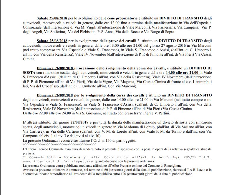 Ecco la parte dell’ordinanza Comunale, che prevede divieti di sosta e strade chiuse per lo svolgimento delle Corse a Vuoto, e per le cene Propiziatorie nella giornata di domani 25/08 e Domenica 26/08