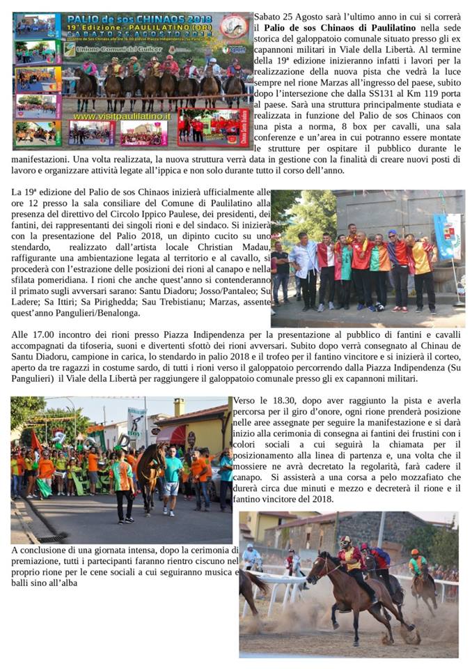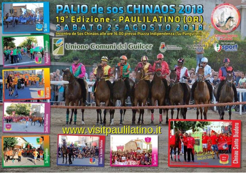 Mancano pochissime ore all’inizio della 19ª edizione del Palio de sos Chinaos di Paulilatino, una manifestazione di tutta la comunità pauleseistituita dal Circolo Ippico Paulese con la collaborazione di tutta la cittadinanza per tenere vivo lo spirito di socializzazione e lo spirito di ospitalità che caratterizza i paulesi. L’ Amministrazione Comunale sta lavorando sia per tenere viva questa manifestazione che per migliorarla e farla crescere facendola diventare anche un evento conosciuto fuori dai confini regionali e un attrattore turistico. Nella cerimonia di presentazione del palio 2018 e di estrazione delle posizioni dei “chinaos” (rioni) al canapo il sindaco presenterà alla popolazione il progetto per la nuova sede del palio che verrà realizzato nei prossimi mesi. L’appuntamento è per domani SABATO 25 Agosto 2018 alle ore 12 presso la sala consiliare del Comune di Paulilatino. L’inizio della manifestazione è programmato per le ore 16.30 / 17.00 in piazza Indipendenza (Su Pangulieri) con la presentazione dei chinaos, la sfilata verso il galoppatoio comunale e la gara per terminare con le cene nei singoli rioni.