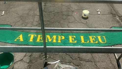“Il comitato Under del borgo San Lazzaro ancora in azione!!! Abbiamo pensato a lungo a cosa potessimo organizzare in questa calda settimana di agosto, proprio nella settimana che precede il palio. Una domenica di maggio ci rivolgemmo al nostro caro Don Mario e gli chiedemmo se fosse d’accordo alla realizzazione di un disegno davanti il sagrato della chiesa, un qualcosa che rappresentasse al meglio il nostro borgo, come ad esempio “la goccia”. Rimase un po’ lì e poi ci disse: “Realizziamo uno STRADALES!”…e stradales fu! Una volta disegnato il progetto e organizzata la squadra il cantiere ha dato inizio ai lavori! Ci siamo improvvisati ingegneri, decoratori, imbianchini e geometri e in men che non si dica il nostro stemma era pronto. Una dimensione di 12 metri per nove, un risultato al di sopra delle nostre aspettative!! Entusiasti dell’ “opera d’arte” siamo corsi a fotografarla dall’alto: ancora più bella!!! Mancava solo un dettaglio…Il nostro motto! Detto fatto. Abbiamo completato con la scritta “A temp e leu! “. Ora è pronto, pronto a fare da cornice ai nostri colori, al nostro entusiasmo e alla nostra voglia di distinguerci! Ieri pomeriggio, terminati i lavori di tinteggiatura, ci siamo riuniti nell’oratorio della nostra parrocchia per ripassare e imparare i cori della tifoseria giallo verde: è stato divertente! I Giovani Ramarri hanno concluso il pomeriggio facendo alcuni giochi di squadra. La settimana è appena cominciata si può dire e da fare c’è ancora tanto, ma sempre uniti e volenterosi ne usciremo vittoriosi!!! A temp e leu!