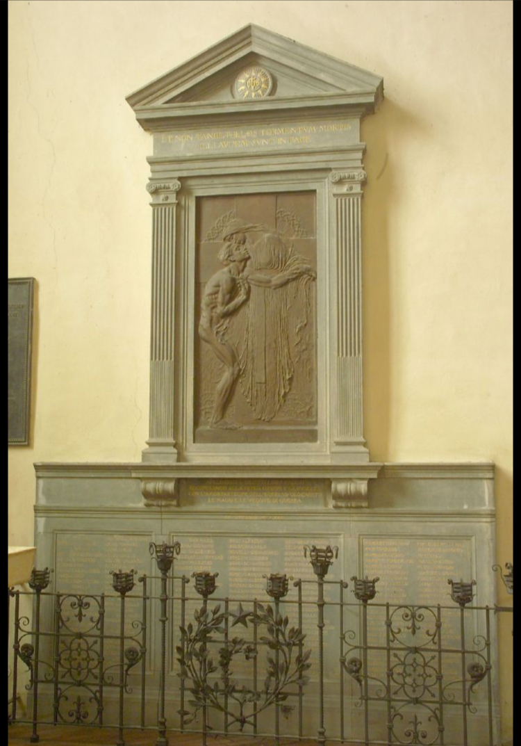 Sarà questa la seconda volta che il drappellone verrà portato nella Basilica di San Domenico, la precedente fu nel 1980, nel Palio dedicato al VI centenario dalla morte di Santa Caterina. La chiesa non è stata scelta casualmente, infatti qui vi è conservato il monumento ai caduti della Prima Guerra Mondialerealizzato da Fulvio Corsini nel 1920 su commissione dell’Associazione Nazionale Madri, Vedove e Familiari dei caduti e dispersi per essere originariamente posto nella chiesa di San Martino. Nel 1927 fu poi collocato dove lo vediamo adesso, cioè nella terza cappella del transetto a destra dell’altar maggiore, anche se l’idea era di collocarlo nella sottostante Cripta. Il monumento si compone di un tabernacolo con un bassorilievo bronzeo raffigurante l’allegoria della morte del soldato, sovrastato da una base rettangolare dove sono riportati i nomi dei caduti. Nell’architrave del tabernacolo troviamo la scritta latina ET NON TANGERE ILIOS TORMENTUM MORTIS ILLI AUREM SUNT IN PACEM. Sotto il bassorilievo c’è la dedica: AI GLORIOSI E DILETTI LORO CADUTI/RECUPERANDO ALLA PATRIA CONFINI E GRANDEZZA/CON L’AMOR PARTECIPE DELL’ECCELSO OLOCAUSTO/LE MADRI E LE VEDOVE DI GUERRA/XXI OTTOBRE MCMXXIII