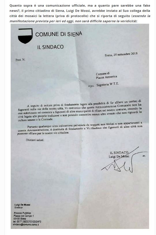 Siena: Fake News? Il Palio di Siena incontra il Palio dei Normanni di Piazza Armerina ? Lettera del Sindaco di Siena al Sindaco di Piazza Armerina ? Fonte: http://www.vivienna.it/2018/09/29/fake-news-il-palio-dei-normanni-incontra-il-palio-di-siena-lettera-del-sindaco-di-siena-al-suo-collega-di-piazza-armerina/ Condividi sul web: Fai clic per condividere su Facebook (Si apre in una nuova finestra) Facebook Fai clic per condividere su WhatsApp (Si apre in una nuova finestra) WhatsApp Fai clic per condividere su Telegram (Si apre in una nuova finestra) Telegram Fai clic per condividere su X (Si apre in una nuova finestra) X Fai clic qui per stampare (Si apre in una nuova finestra) Stampa Fai clic per inviare un link a un amico via e-mail (Si apre in una nuova finestra) E-mail Mi piace Caricamento... Correlati