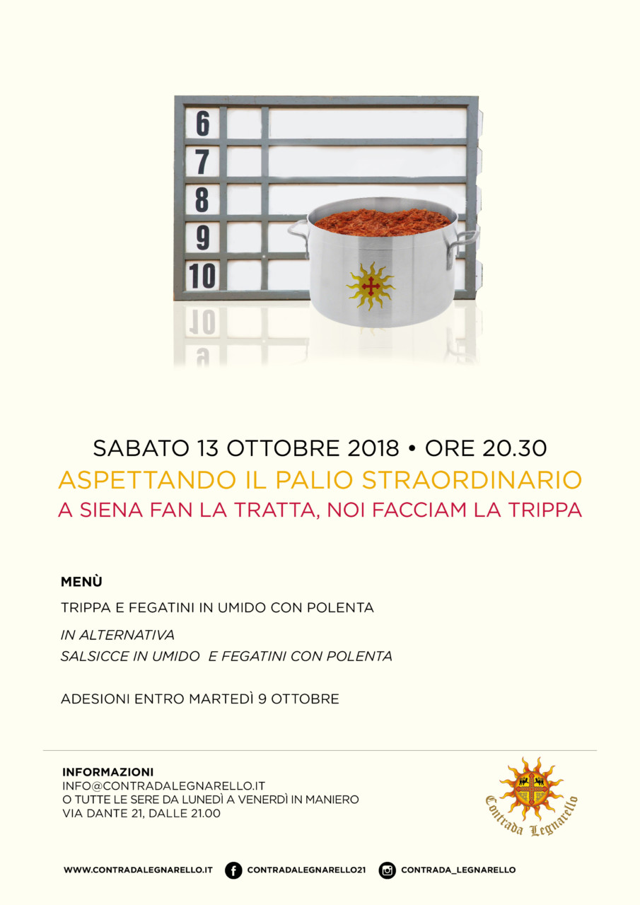 Aspettando il Palio di Siena straordinario, che si correrà il 20 ottobre 2018 in occasione del centenario della fine della Prima Guerra Mondiale, la Contrada Legnarello organizza una cena unica e diversa dal solito: mentre a Siena fan la “tratta”… in via Dante si fa la trippa!