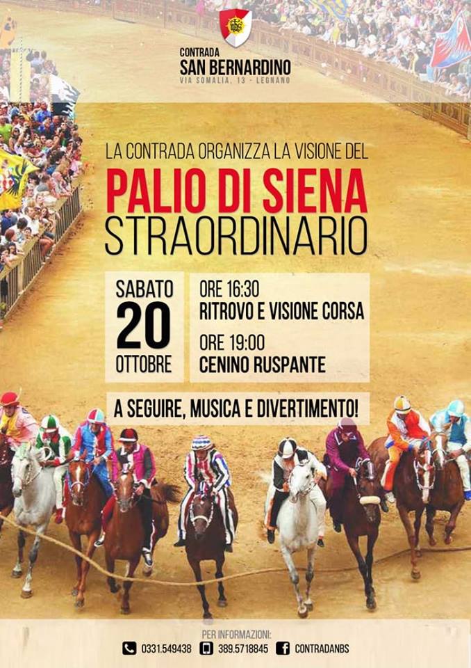 Palio di Legnano, Contrada San Bernardino: 20/10 Visione Palio Straordinario di Siena in Maniero 🐎🐎IMPERDIBILE APPUNTAMENTO 🐎🐎 SABATO 20 OTTOBRE DALLE ORE 16.30, PRESSO LA CONTRADA SAN BERNARDINO, VERRÀ TRASMESSA L’EDIZIONE STRAORDINARIA DEL PALIO DI SIENA🐎 A SEGUIRE: ⌚🍴19.00 CENINO RUSPANTE 🎧 MUSICA E TANTO DIVERTIMENTO 📞 Per info e prenotazioni E-mail: contradanbs@email.it Tel. Segreteria Maniero 0331/ 549438 (Martedì e Giovedì dopo le ore 21.30) Tel. Cell. Maniero 389/5718845 (sms e WhatsApp) VI ASPETTIAMO!! Massi Condividi sul web: Fai clic per condividere su Facebook (Si apre in una nuova finestra) Facebook Fai clic per condividere su WhatsApp (Si apre in una nuova finestra) WhatsApp Fai clic per condividere su Telegram (Si apre in una nuova finestra) Telegram Fai clic per condividere su X (Si apre in una nuova finestra) X Fai clic qui per stampare (Si apre in una nuova finestra) Stampa Fai clic per inviare un link a un amico via e-mail (Si apre in una nuova finestra) E-mail Mi piace Caricamento... Correlati