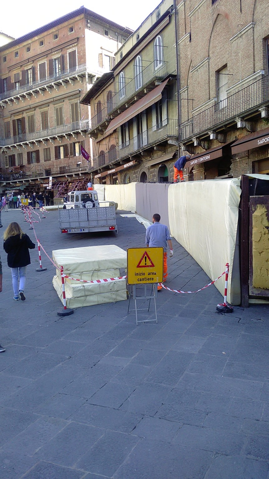 In Piazza del Campo si respira aria di Palio. Da questa mattina sono state montate alcune parti dei palchi, e addirittura prima della Mossa più di una parte di un palchi e montato il Verrocchio. Il Palio si avvicina e Piazza del Campo e tutta Siena si prepara all’evento senza tralasciare nessun particolare.