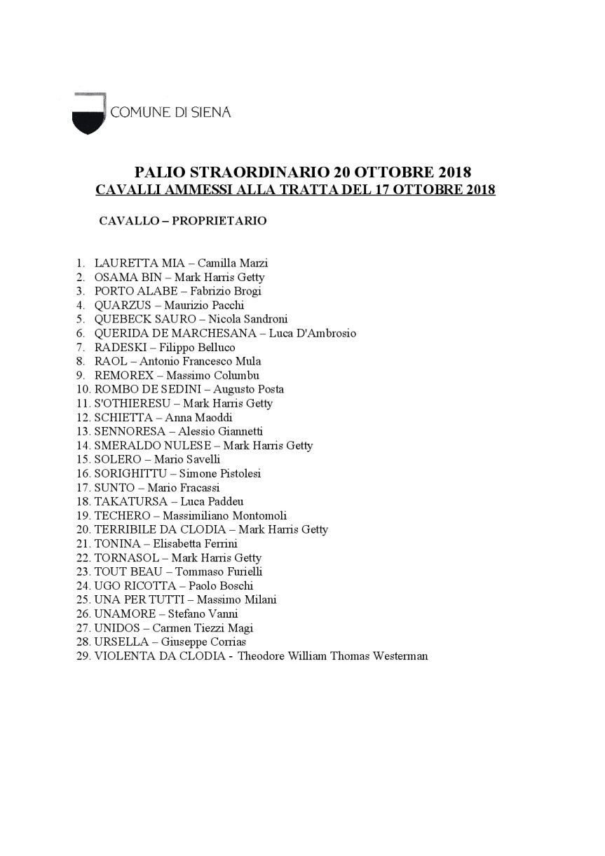 Palio di Siena, Palio Straordinario: Ecco i 29 cavalli ammessi alla Tratta E’ stata diramata la lista dei cavalli ammessi alla Tratta di Domani 17/10. Sono 29 cavalli e vi posto la lista qua sotto già scaricata Massi Condividi sul web: Fai clic per condividere su Facebook (Si apre in una nuova finestra) Facebook Fai clic per condividere su WhatsApp (Si apre in una nuova finestra) WhatsApp Fai clic per condividere su Telegram (Si apre in una nuova finestra) Telegram Fai clic per condividere su X (Si apre in una nuova finestra) X Fai clic qui per stampare (Si apre in una nuova finestra) Stampa Fai clic per inviare un link a un amico via e-mail (Si apre in una nuova finestra) E-mail Mi piace Caricamento... Correlati
