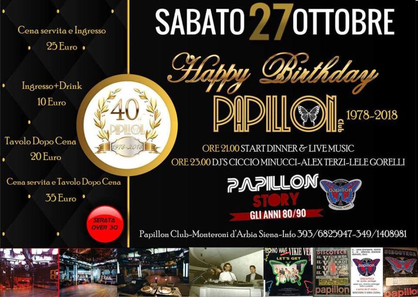 Sabato 27 Ottobre la Discoteca Papillon festeggia i suoi primi 40 anni di attivita’ e lo fa con una grande festa che inizera’ dalla cena spettacolo alle ore 21.00 insieme alla musica di Simona Bruni e David Baglioni per poi proseguire con alcuni dei Dj’s storici del locale senese che suoneranno le grandi hit degli anni 80 e 90.