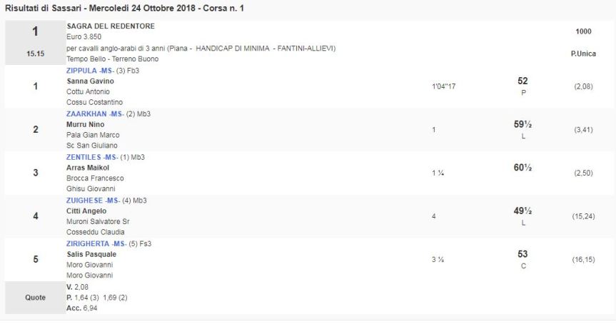 Risultati 1^ Corsa, Premio Sagra del Redentore vinta da Zippula