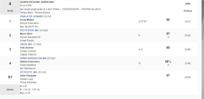 Risultati 4^ Corsa, Premio Giunta Regione Sardegna vinta da Zibala de Gonare