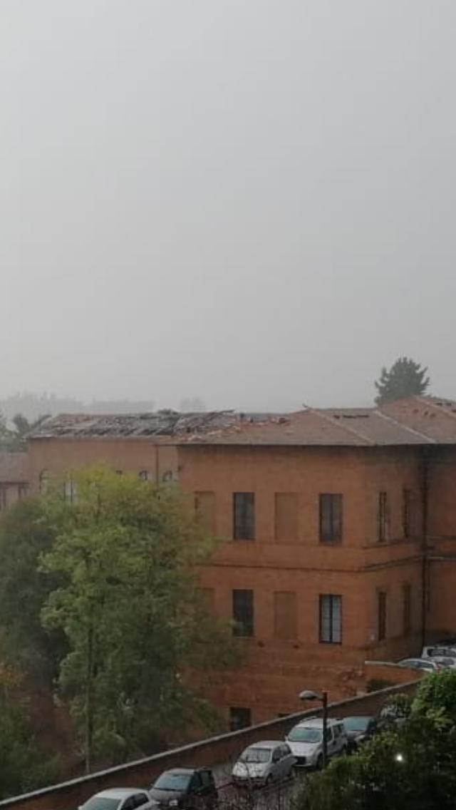 Le forti raffiche di vento che si sono abbattute poco fa su Siena, hanno seriamente danneggiato il tetto della Scuole elementare Aurelio Saffi, in Via Ettore Bastianini. Non si registrano persone ferite, ma da come si vede dalla foto sotto il tetto è seriamente danneggiato, e dovranno essere presi tempestivi provvedimenti da parte del Provveditoriato agli Studi. Erano presenti all’interno della scuola i bambini che fanno il tempo pieno, e grande è stato lo spavento per loro e insegnanti e personale presente.