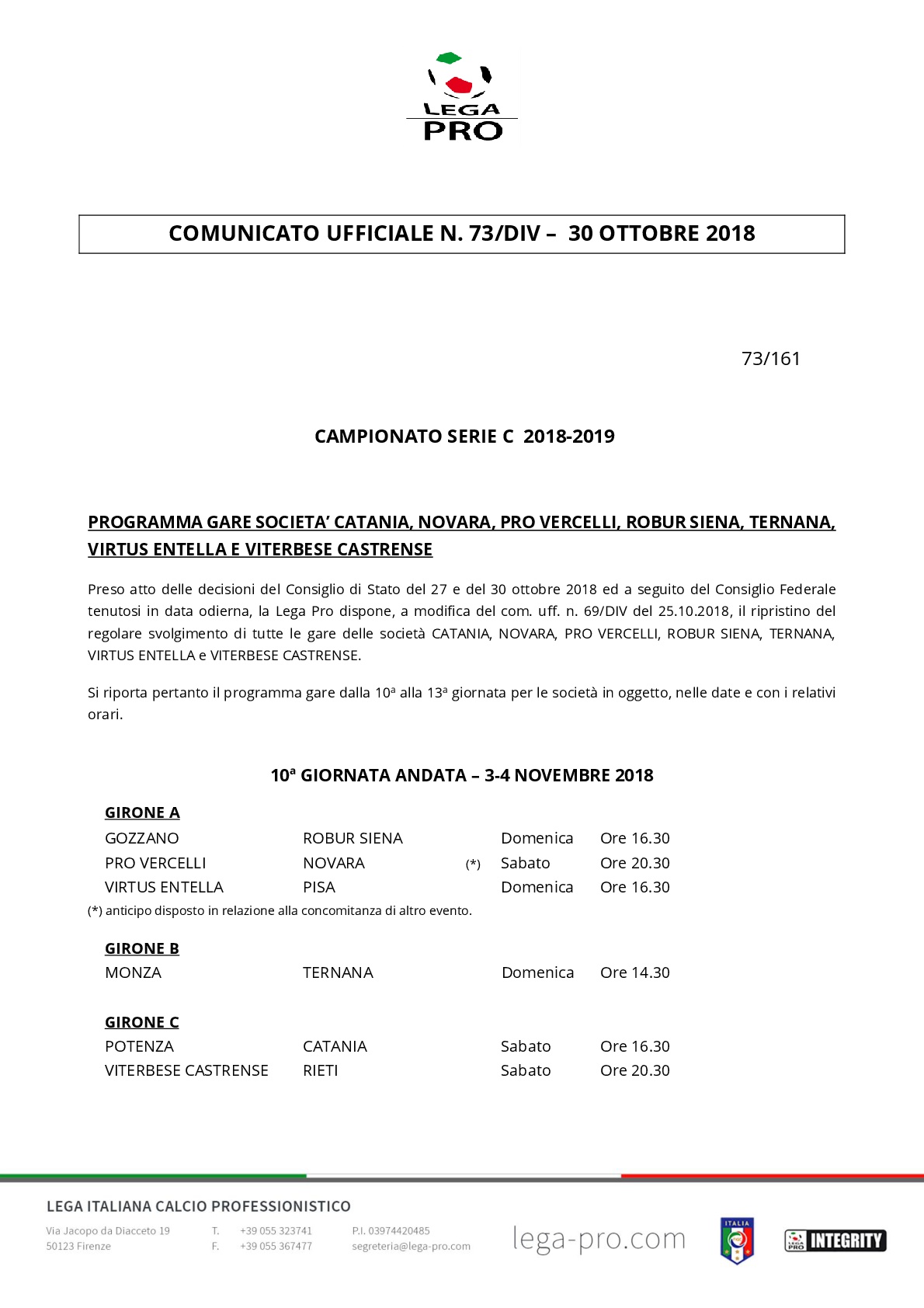 ” Preso atto delle decisioni del Consiglio di Stato del 27 e del 30 ottobre 2018 ed a seguito del Consiglio Federale tenutosi in data odierna, la Lega Pro dispone, a modifica del com. uff. n. 69/DIV del 25.10.2018, il ripristino del regolare svolgimento di tutte le gare delle società CATANIA, NOVARA, PRO VERCELLI, ROBUR SIENA, TERNANA, VIRTUS ENTELLA e VITERBESE CASTRENSE”: questo l’incipit del comunicato della Lega Pro che ufficializza quindi il Format 19 per la B e il via al campionato delle squadre che erano invischiate nella questione ripescaggi/riammissioni.”