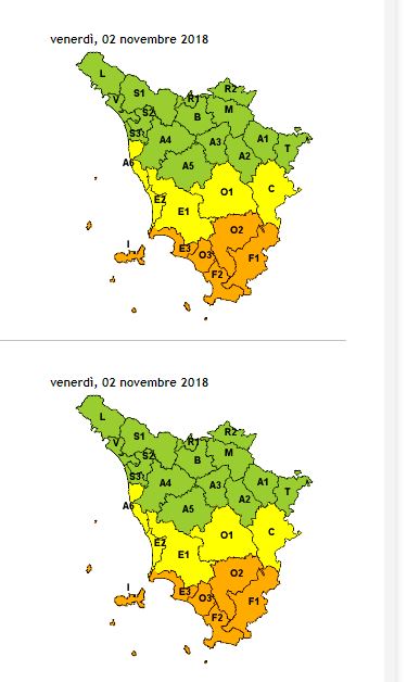 “Temporali forti, con rischio idrogeologico e idraulico per il reticolo minore nel sud della Toscana. Questo quanto prevede lo stato di allerta emesso dal Centro Funzionale Regionale e che è valido dalle ore 3 di venerdì 2 novembre per tutta la giornata.