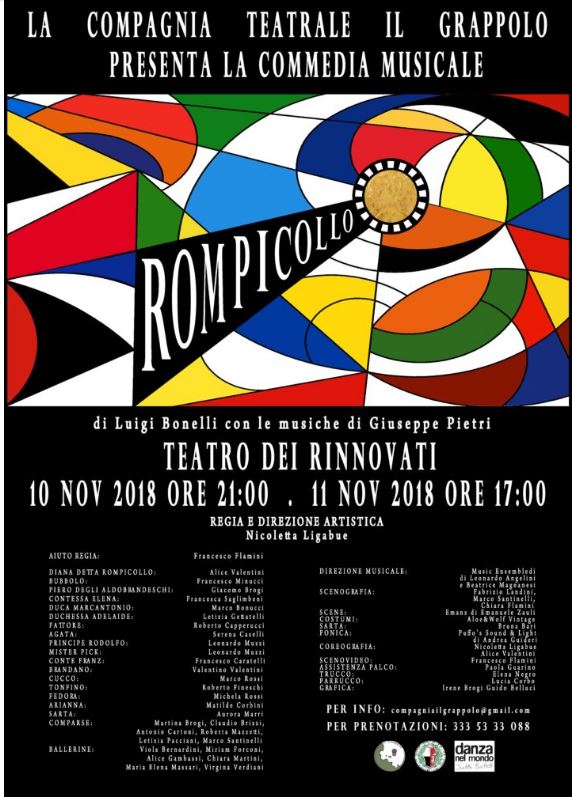 Si racconta di Siena e di Palio nella Commedia Musicale “Rompicollo” che andrà in scena al Teatro dei Rinnovati il 10 e 11 Novembre 2018. Lo spettacolo è tratto dall’Operetta scritta da Luigi Bonelli, commediografo senese e selvaiolo, che volle omaggiare la sua Città e la sua Contrada con quest’opera. Dopo tanti anni Nicoletta Ligabue, sua nipote, porterà in scena come regista “Rompicollo” trasformando l’Operetta in Commedia musicale! Alcuni selvaioli saranno impegnati sul palco insieme agli attori della Compagnia teatrale Il Grappolo e sarebbe bello che ci fossero anche tanti selvaioli in Teatro! Nella Locandina in allegato potrete trovare i recapiti per le prenotazioni. La prevendita dei biglietti è iniziata il 22 Ottobre 2018 ed il ricavato dello Spettacolo andrà interamente in beneficenza.