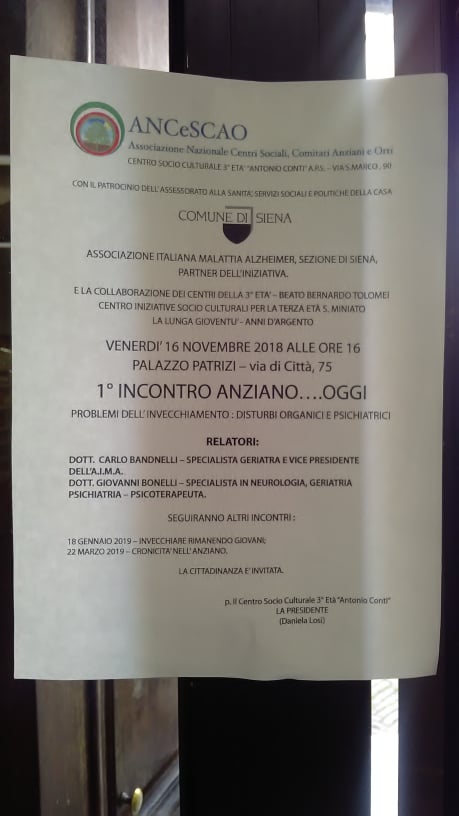 Si svolgerà Venerdì 16/11 alle ore 16 presso palazzo Patrizi, in Via di Città 75, il 1° Incontro Anziano Oggi, patrocinato dal Comune di Siena e l’ANCeSCAO.