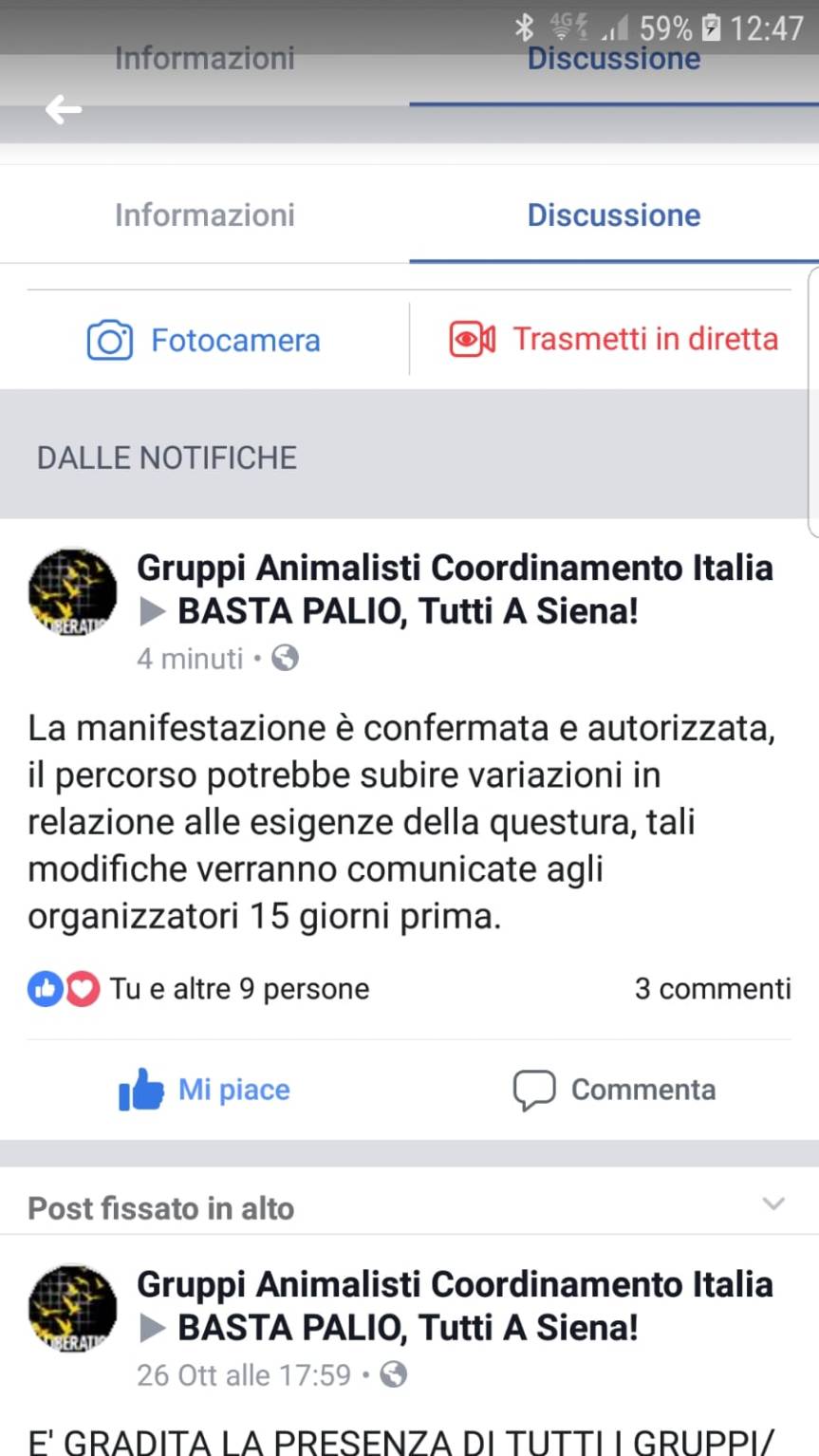 Su fb nella pagina dedicata alla manifestazione animalista che gli animalisti vogliono svolgere a Siena il 09/12, è apparso un posto dove si capisce che la Questura di Siena, nella persona del Questore ha autorizzato la manifestazione.