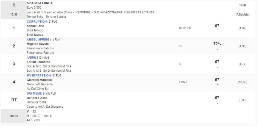 1^ Corsa Premio Spiaggia Lunga vinta da Carlo Sanna detto “Brigante” su Corruption