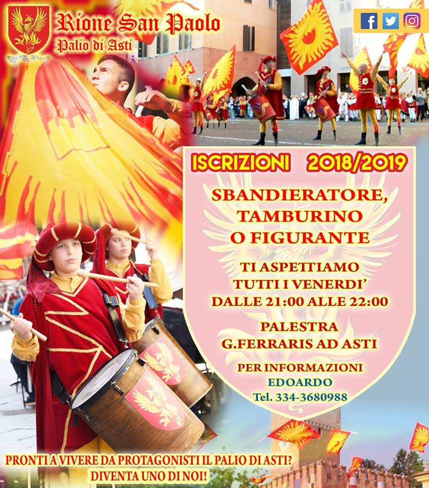 Palio di Asti, Rione San Paolo: Iscrizioni Corsi Sbandieratore, Tamburino o Figurante 2018-2019 Il Rione Comunica che sono aperte le iscirizoni al Corso per Sbandieratore, Tamburino o Figurante per l’Annata paliesca 2018-2019: Per le info e per partecipare i contatti sono nella locandina qua sotto Condividi sul web: Fai clic per condividere su Facebook (Si apre in una nuova finestra) Facebook Fai clic per condividere su WhatsApp (Si apre in una nuova finestra) WhatsApp Fai clic per condividere su Telegram (Si apre in una nuova finestra) Telegram Fai clic per condividere su X (Si apre in una nuova finestra) X Fai clic qui per stampare (Si apre in una nuova finestra) Stampa Fai clic per inviare un link a un amico via e-mail (Si apre in una nuova finestra) E-mail Mi piace Caricamento... Correlati