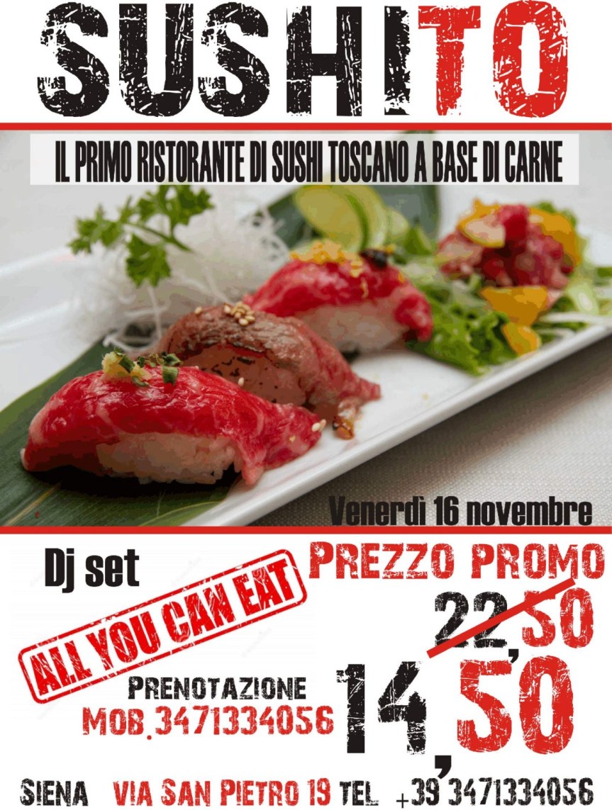 Si tratta di una serata di degustazione di Sushi interamente realizzato con carne toscana delle nostre zone a chilometri zero. Una bella serata da trascorrere in compagnia mangiando buon cibo accompagnato da ottimi vini della nostra regione, selezionati personalmente dallo chef Simone e dai suoi collaboratori.