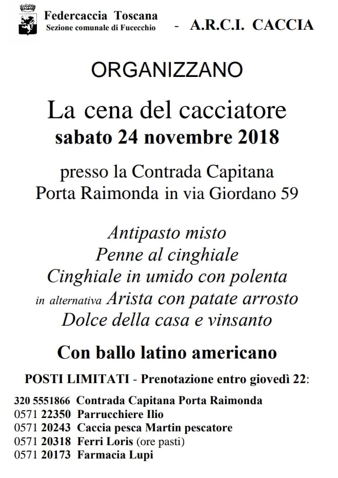 Palio di Fucecchio, Contrada Porta Raimonda: 24/11 Cena del Cacciatore SABATO 24 NOVEMBRE in collaboraziome con Federcaccia Toscana e A.R.C.I. CACCIA ritorna a gran richiesta la CENA DEL CACCIATORE!!!! Prenotazioni entro giovedì 22 ai numeri indicati nel manifesto. Condividi sul web: Fai clic per condividere su Facebook (Si apre in una nuova finestra) Facebook Fai clic per condividere su WhatsApp (Si apre in una nuova finestra) WhatsApp Fai clic per condividere su Telegram (Si apre in una nuova finestra) Telegram Fai clic per condividere su X (Si apre in una nuova finestra) X Fai clic qui per stampare (Si apre in una nuova finestra) Stampa Fai clic per inviare un link a un amico via e-mail (Si apre in una nuova finestra) E-mail Mi piace Caricamento... Correlati