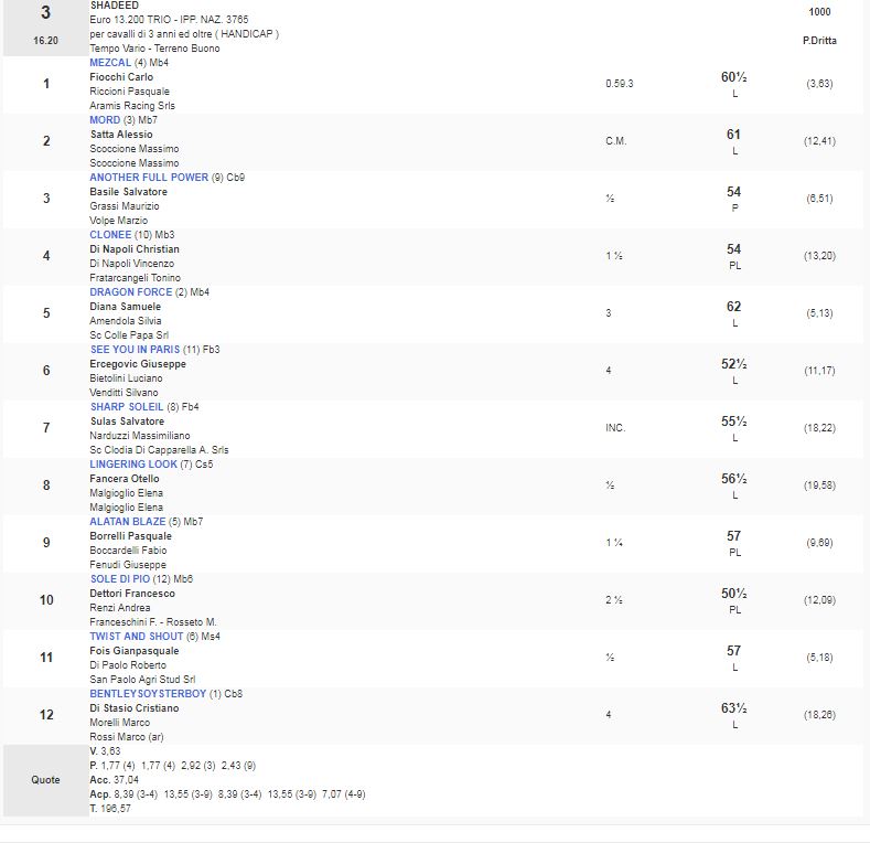 Ippica, Roma: Oggi 30/11 Risultati 3^ e 4^ Corsa Vincono Mezcal e Pabble Beach 3^ Corsa Premio Shadeed vinta da Mezcal 4^ Corsa Premio Oh So Sharp vinta da Pabble Beach Condividi sul web: Fai clic per condividere su Facebook (Si apre in una nuova finestra) Facebook Fai clic per condividere su WhatsApp (Si apre in una nuova finestra) WhatsApp Fai clic per condividere su Telegram (Si apre in una nuova finestra) Telegram Fai clic per condividere su X (Si apre in una nuova finestra) X Fai clic qui per stampare (Si apre in una nuova finestra) Stampa Fai clic per inviare un link a un amico via e-mail (Si apre in una nuova finestra) E-mail Mi piace Caricamento... Correlati
