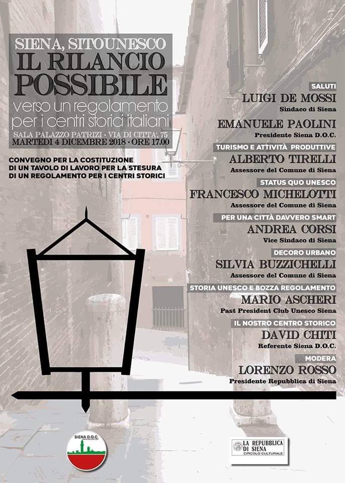 Siena: Oggi 04/12 ore 17.00 “Siena, Centro Storico e sito Unesco, il rilancio possibile. Verso un Regolamento del Centro Storico”.