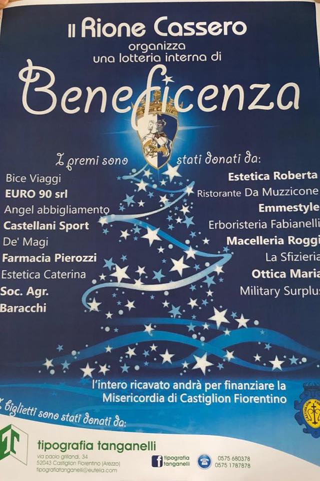 Durante tutte le Feste Natalizie sarà possibile acquistare i biglietti per la lotteria di beneficenza,il cui incasso sarà devoluto interamente alla Misericordia di Castiglion Fiorentino che grazie alla sua collaborazione ci permette ormai da 4 anni di allestire il presepe e di tenere aperto uno dei tesori nascosti di Castiglion Fiorentino, la Chiesa della Buonamorte.