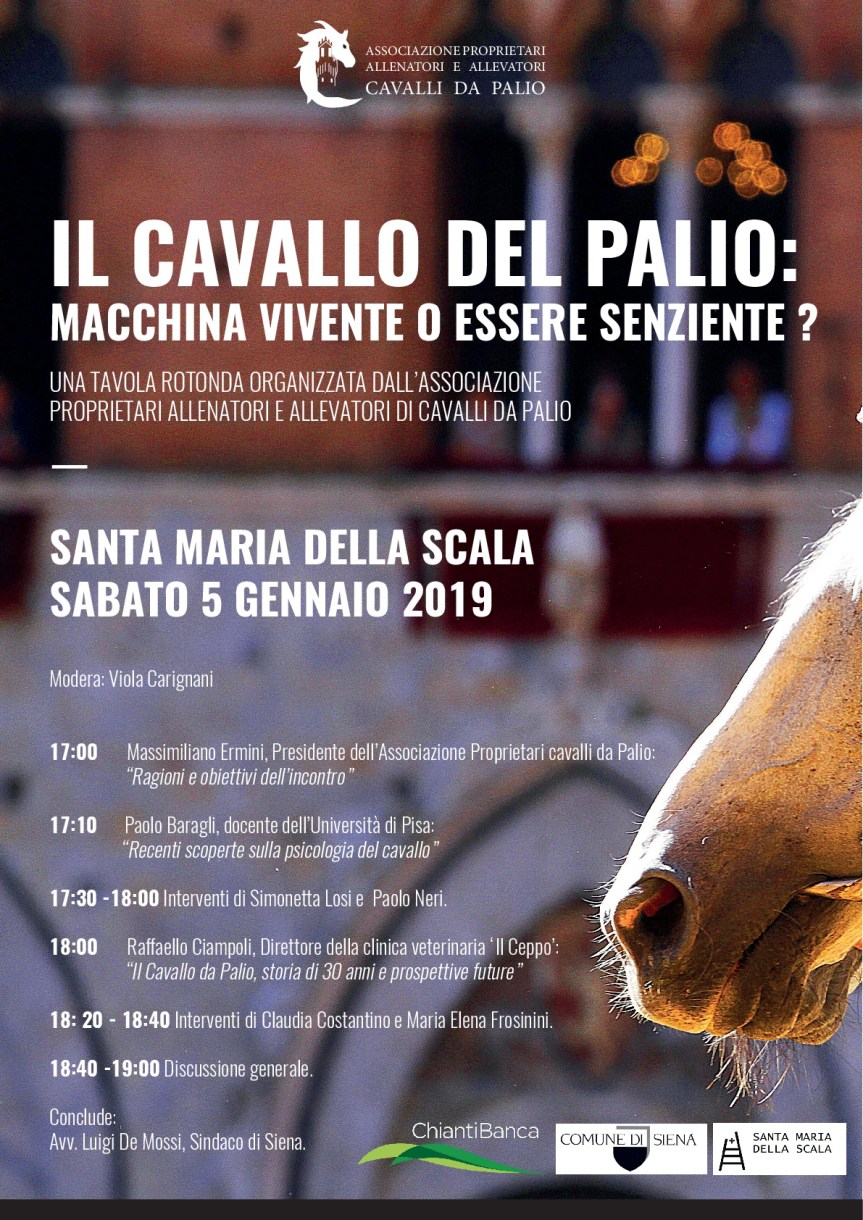 Sabato 05/01/2019 al Santa Maria della Scala sarà effettuato un’incontro, una tavola rotonda sull’argomento ” Il cavallo da Palio: Macchina vivente o essere senziente?”