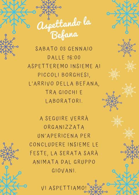 Invitiamo tutti i piccoli Borghesi e le loro famiglie, a partecipare all’arrivo della Befana durante l’attesa, tanti giochi laboratori e divertimento!