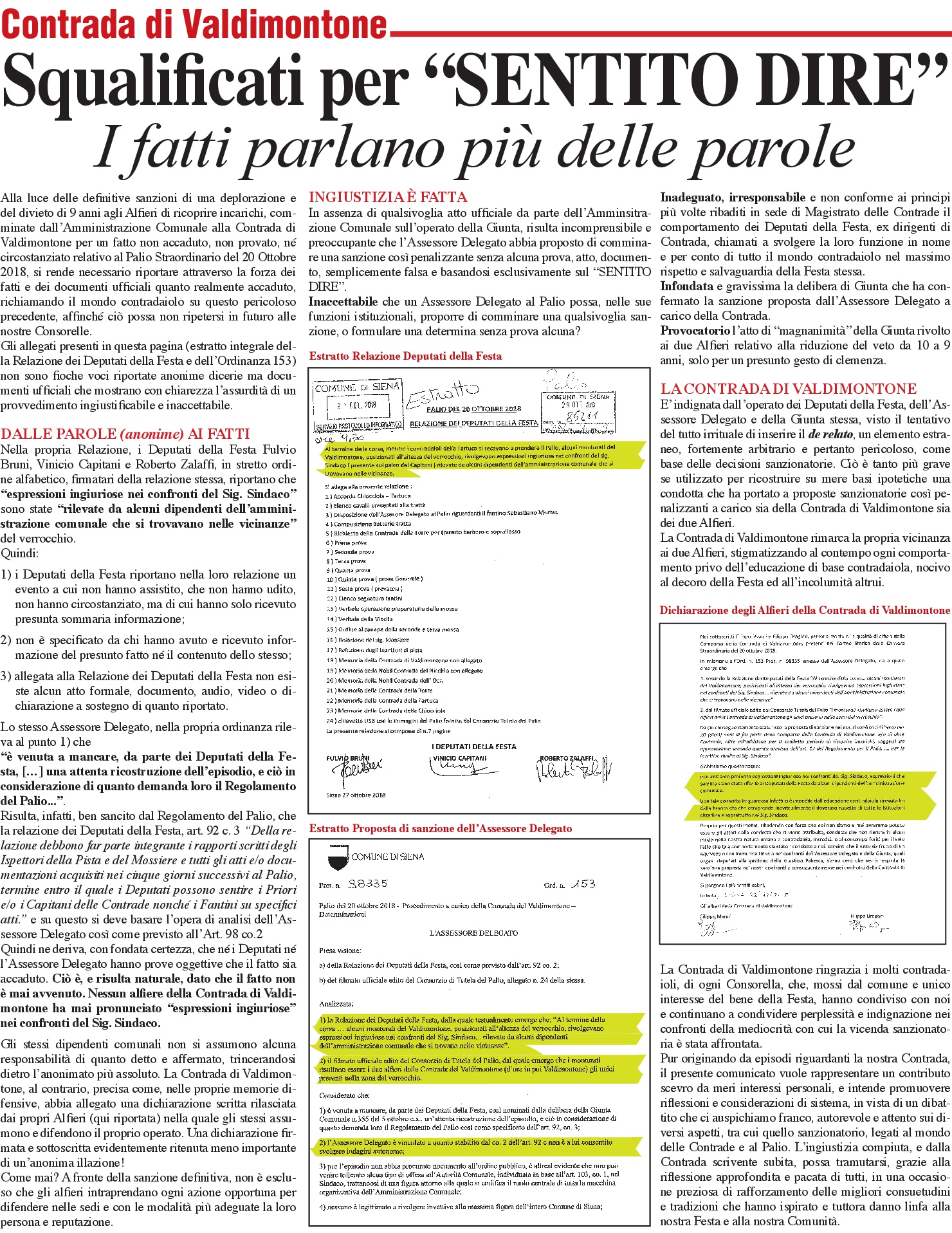 Qua sotto troverete un dettagliato duro comunicato stampa della Contrada, contro la squalifica comminata alla Contrada e i 9 anni di squalifica comminati alla coppa di alfieri,rappresentanti la Contrada nel Palio del 20/10/2018.