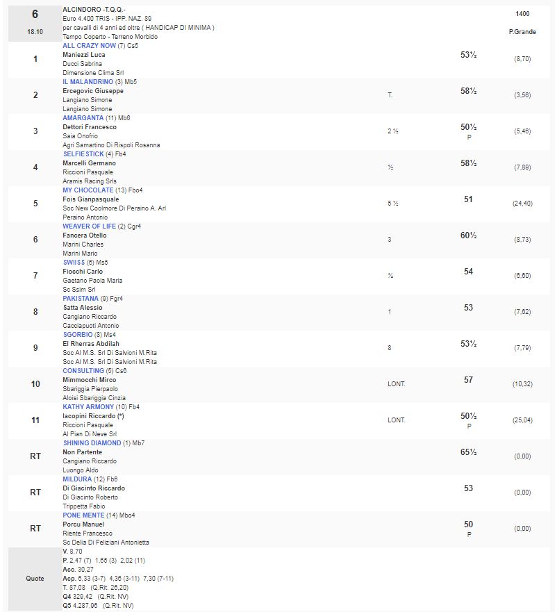 6^ Corsa Premio Alcindoro – T.Q.Q. – vinta da All Crazy Now
