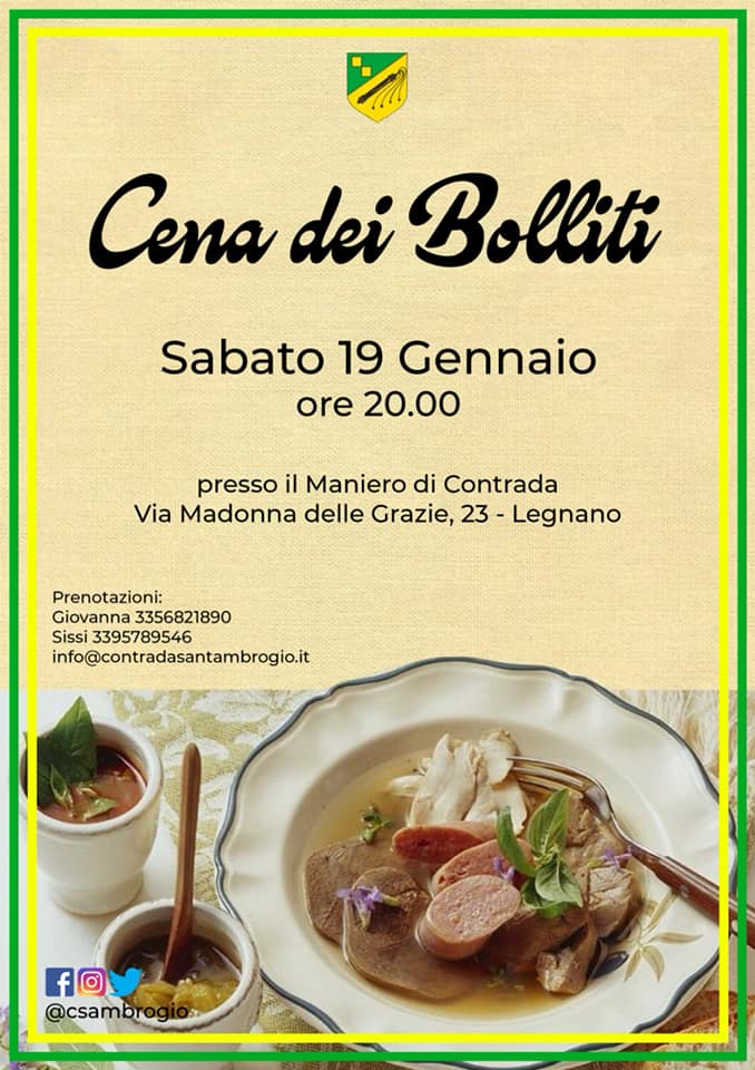 Palio di Legnano, Contrada Sant’Ambrogio: 19/01 Cena dei Bolliti A Gennaio torna un grande classico… CENA dei BOLLITI Sabato 19 Gennaio dalle 20.00 Menù: Passatelli in brodo Selezione di bolliti con salse e mostarda Dolce a sorpresa Per info e prenotazioni: Giovanna 3356821890 Sissi 3395789546 Condividi sul web: Fai clic per condividere su Facebook (Si apre in una nuova finestra) Facebook Fai clic per condividere su WhatsApp (Si apre in una nuova finestra) WhatsApp Fai clic per condividere su Telegram (Si apre in una nuova finestra) Telegram Fai clic per condividere su X (Si apre in una nuova finestra) X Fai clic qui per stampare (Si apre in una nuova finestra) Stampa Fai clic per inviare un link a un amico via e-mail (Si apre in una nuova finestra) E-mail Mi piace Caricamento... Correlati
