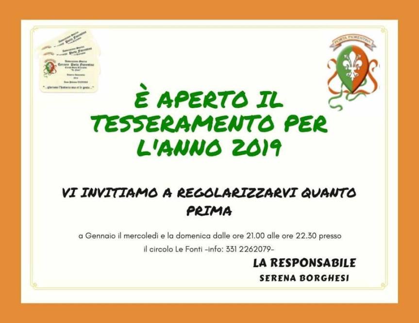 È aperto il tesseramento per l’anno 2019, troverete per tutto il mese di Gennaio, il mercoledì e la domenica dalle 21 alle 22.30 la